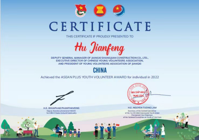 近日,2022年東盟國際合作青年志愿者獎頒獎儀式在越南廣平省舉行。該活動由越南胡志明共青團中央和越南青年國家委員會主辦。東盟國家以及中國和日本的青年機構、青年組織推薦的10位青年志愿者和11個青年志愿服務組織獲獎。經中國青年志愿者協會推薦,中國青年志愿者協會常務理事、江西省青年志愿者協會會長、江西上建建設有限公司副總經理胡劍峰獲評“2022年東盟國際合作青年志愿者獎”,也是我國唯一獲此榮譽的先進個人。