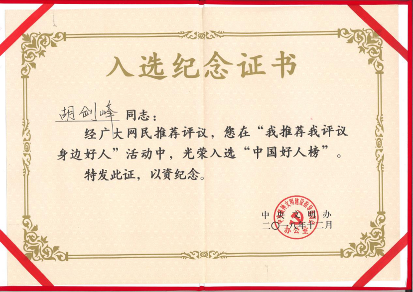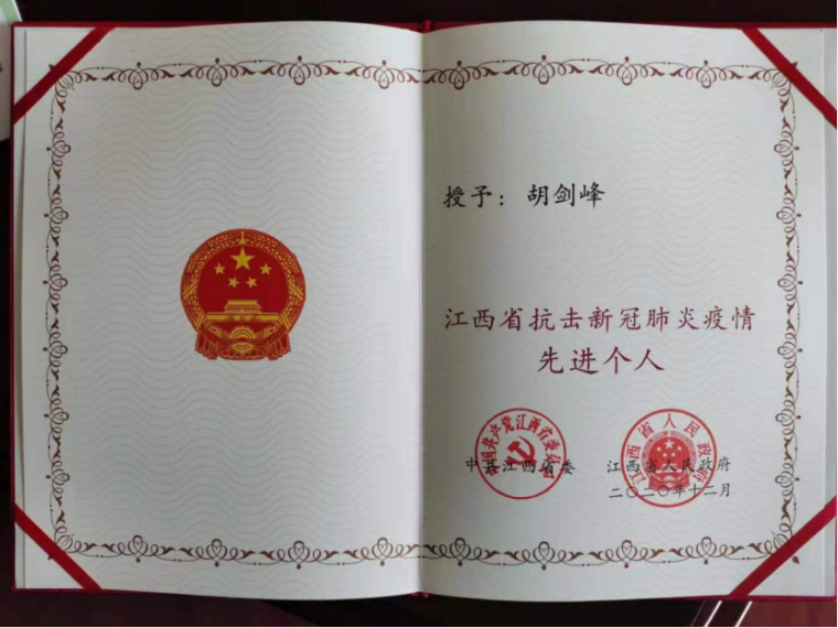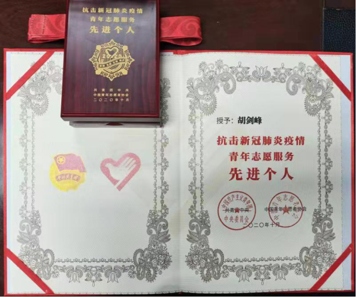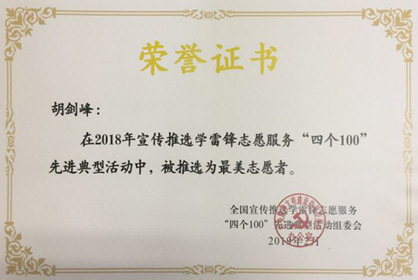 胡劍峰連續22年參與應急救援、生態環保、大型賽會、幫困助殘等志愿服務,志愿服務時長達11600余小時,組織志愿服務活動近千場次、參與募集公益資金3000余萬元。累計幫助困難群眾5萬余人次,長期幫扶孤兒60余人,結對資助10人;2008年汶川地震后,他作為江西省第一批災后重建志愿者,前往江西對口援建的小金縣開展災后重建服務;2020年新冠肺炎疫情發生后,他主動報名成為所居住社區的一名防疫志愿者,連續43天堅守在社區防疫志愿服務一線,開展信息登記、掃碼測溫等服務;累計參與北京奧運會、廣州亞運會、全國城市運動會、中國中部投資貿易博覽會、世界VR產業大會等大型賽會志愿者招募組織、培訓管理等工作數十次;指導孵化培訓志愿服務組織200余個、志愿服務項目500余個、志愿者骨干3萬余人次。