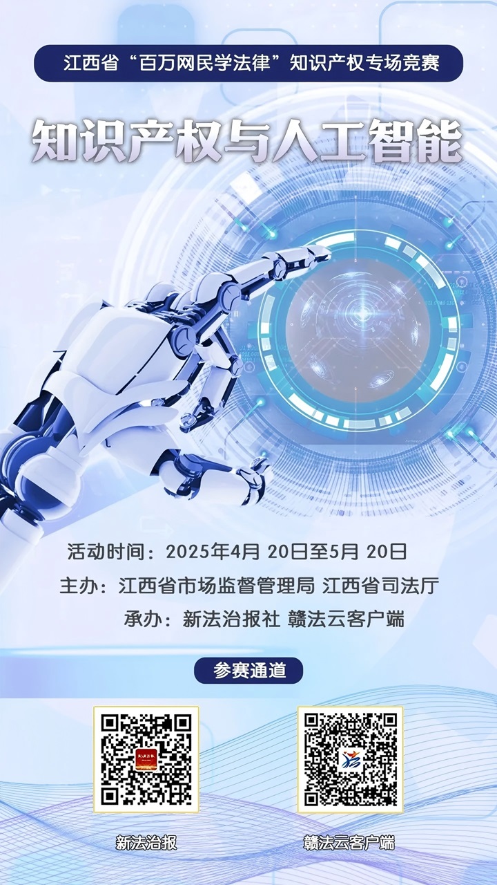 今年4月26日是第25個世界知識產權日。為傳播知識產權文化理念,4月20日至5月20日,由江西省市場監督管理局、江西省司法廳主辦,新法治報社、贛法云客戶端承辦開展江西省“百萬網民學法律”知識產權專場知識競賽活動。