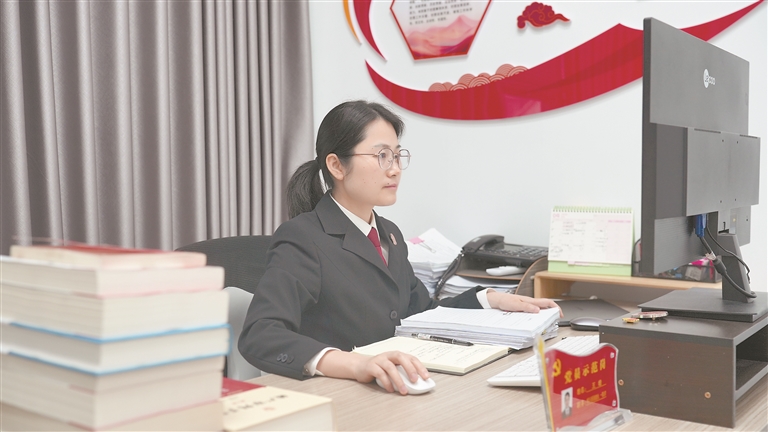 走進旭日法庭,王婧正與企業代表通過電話溝通案件,言談間沉穩從容,透著一股讓人安心的力量。