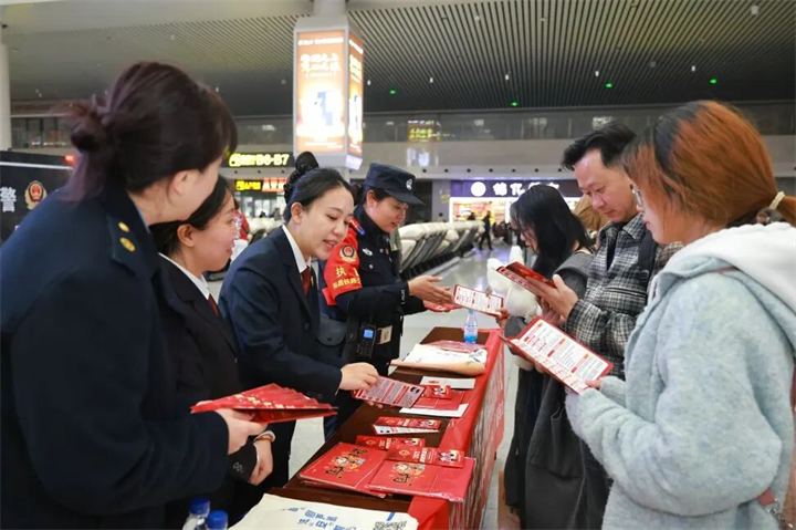 在活動現場,檢察干警熱情地向候車旅客發放法律宣傳資料,并講解法律知識。同時,檢察干警耐心解答旅客提出的問題,并結合日常出行、勞動就業、消費維權等講解憲法知識。