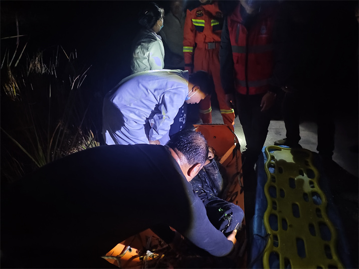 發現老人后,救援人員將老人固定在擔架上,肩扛手抬,輪流接力,在漆黑無路、荊棘遍地的山林中跋涉近兩個小時,最終將老人平穩護送下山,并由等候的120急救車送往醫院。