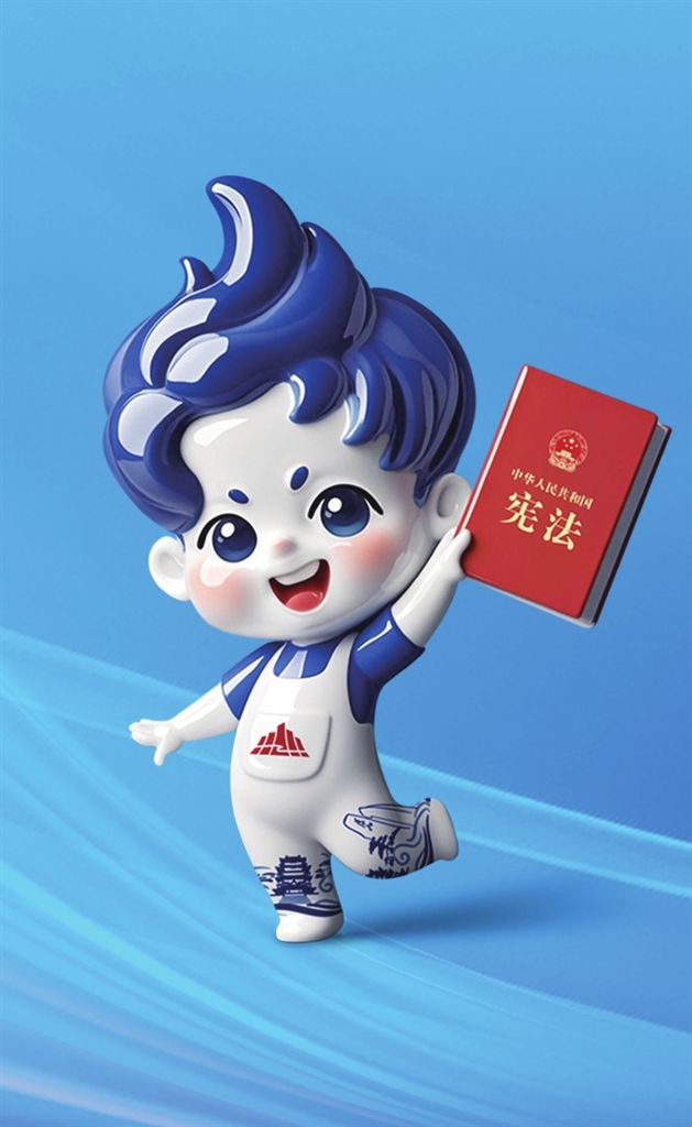 “贛法寶”是從一只青花瓷里走出的普法小精靈,也是江西的普法代言人。“贛法寶”身上細節滿滿:隨身攜帶憲法書本,凸顯憲法核心地位;發型靈感源自省鳥白鶴的翅膀,象征生態江西法治守護;背帶褲童真款式拉近法律與大眾距離,胸部紅色井岡山輪廓線條寓意不忘紅色初心,褲腳上滕王閣、廬山、婺源花海的青花紋樣,寓意著法治種子播撒在贛鄱大地的每一個角落。它還有“魔法口袋”,能掏出法律手冊、普法文創,提供法律服務。