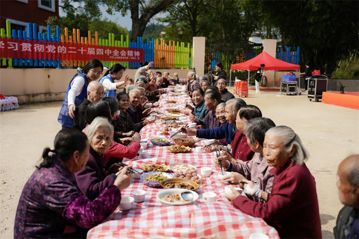 文藝演出與文明集市結束后,孝心長壽宴溫情開席。志愿者們化身“臨時子女”,攙扶高齡老人入席,為行動不便者送餐到桌,長壽面、客家薯圓等美食寓意福壽綿長。飯后,志愿者們為老人們送上低糖糕點、壽面、毛巾等“暖心禮包”,老人們在一片歡聲笑語中感受社會溫情。
