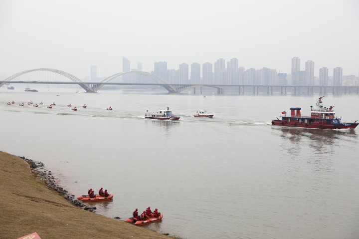“嘟——”隨著一陣急促的汽笛聲響起,現(xiàn)場群眾的目光被吸引到廣場旁的贛江水面上。由1艘戰(zhàn)斗艇、1艘指揮艇、1艘巡邏艇、2艘摩托艇、8艘沖鋒舟、6艘橡皮艇組成的舟艇編隊破浪而來,演示了“橡皮艇+飛翼合成救援”“翻舟自救”等實戰(zhàn)項目。當(dāng)操舟手駕駛橡皮艇在江面疾馳時,岸邊觀眾不自覺地屏住呼吸,當(dāng)“被困人員”成功獲救的那一刻,現(xiàn)場響起熱烈掌聲。